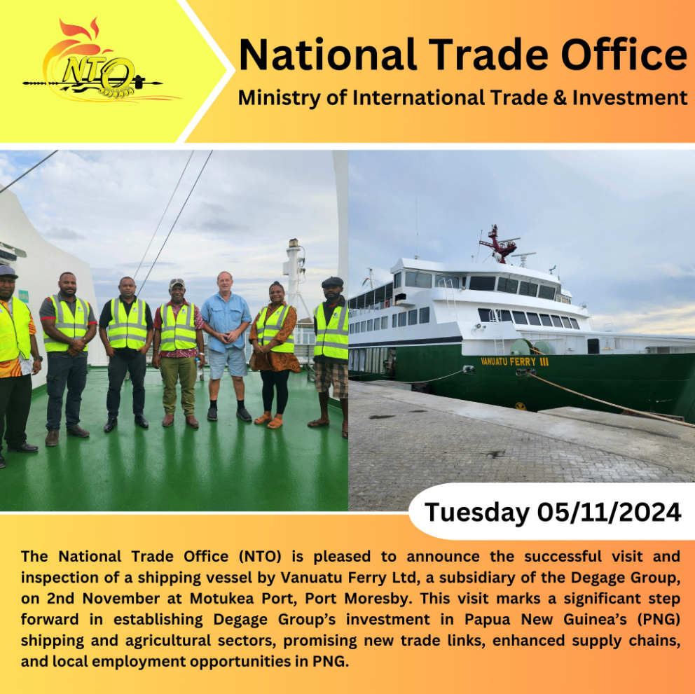 National Trade Office (NTO) Welcomes Degage Group’s Investment in Papua New Guinea’s Shipping IndustryPort Moresby, 5th November 2024 – The National Trade Office (NTO) is
